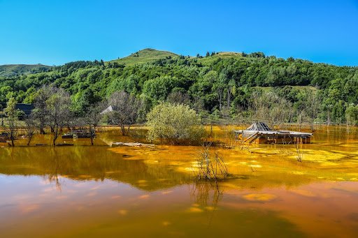 Rios contaminados por materiais quimicos líquidos, como mercúrio.