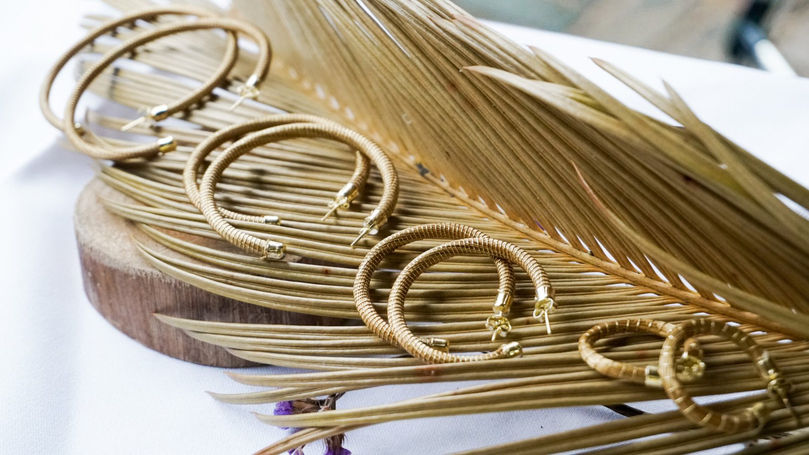 Par de brincos em capim dourado, com ferragens em metal dourado, medindo aproximadamente 5 cm de diâmetro cada um.