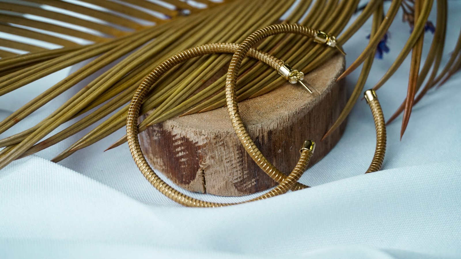 Nossa alternativa de material, à base de plantas é muito leve, de modo que o acessório que brilha como ouro é praticamente de peso imperceptível.