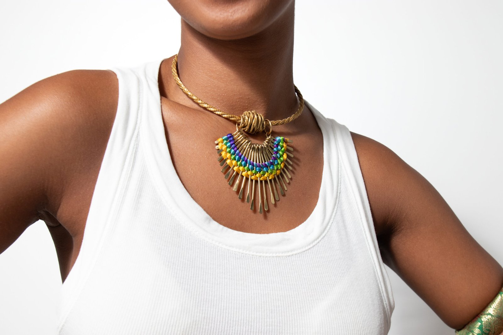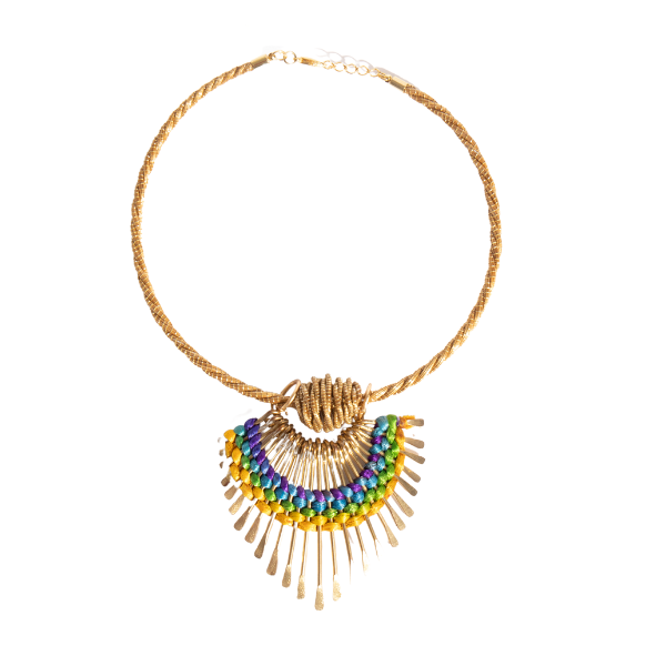 O colar Laskmi Verde é um colar feito de capim dourado, com um pingente removível colorido. O capim dourado é um material natural e rústico, conhecido por sua beleza e durabilidade. O pingente removível colorido adiciona um toque de cor e diversão ao colar, permitindo que você personalize o visual de acordo com o seu gosto e estilo. É uma peça única e vibrante que certamente chamará a atenção. Perfeito para adicionar um toque de natureza e estilo ao seu look.
