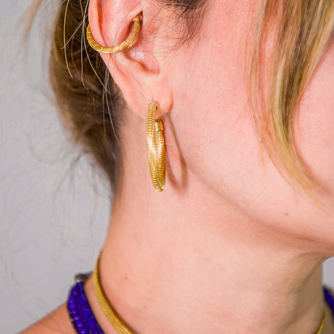 Piercing Andrea, em capim dourado, pode ser usado sozinho ou combinado com outros brincos, fica ótimo com as argolas. E não precisa ter a orelha furada, ele encaixa e se adapta na posição que você escolher.